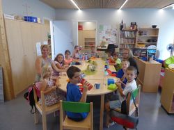 Am 27. August 2019 fand dann auch der Umzug statt. Nun befinden sich die Gr. 1 und 2 im Dachgeschoss, die Gr. 4 im Untergeschoss des Altbaus, die Ganztageskinder der Gr. 3 und die Gr.5 im Neubau.